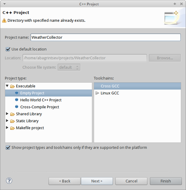 Теперь давайте создадим проект Eclipse. Нажимайте File > New > Project. В появившимся мастере выбирайте C++ Project. Далее как обычно: вводите название, выбирайте Toolchain.