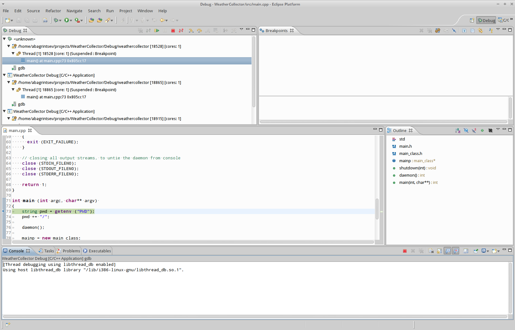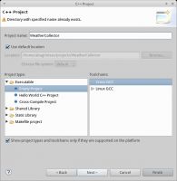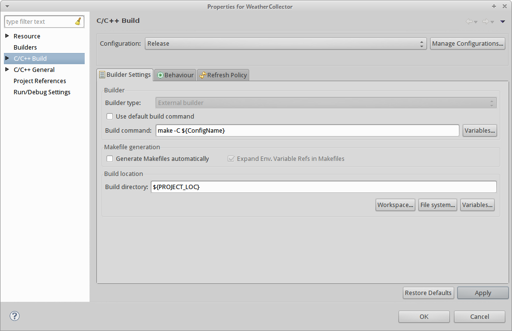 Стоит отметить, что бывали случаи, когда путь на выходной бинарник, в поле C/C++ Application по умолчанию указывал куда-то в CMakeFiles. Забирать его от туда не очень удобно, поэтому не стесняйтесь указывать что-то вроде "Debug/weathercollector" :-)
