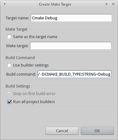 Тоже самое нужно сделать для цели Debug. Target Name, естественно будет Cmake Debug, а Build command: